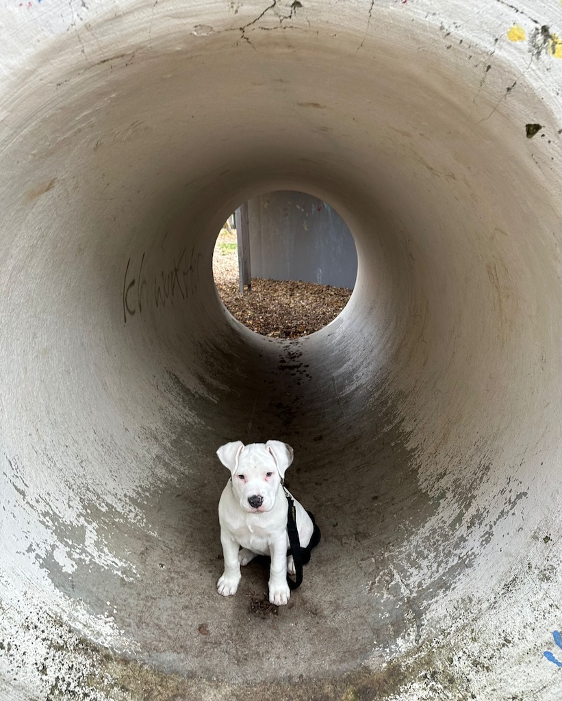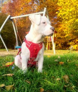 Elli denkt schnell, folglich setzt sie Gezeigtes oft sofort um – sofern es für sie Sinn ergibt. Umweltreize und Menschenmengen meistert sie gelassen, während sie drinnen noch Unterstützung beim Runterfahren benötigt. Wenn man sie aus einem Vorhaben herausnimmt, kann welpentypisches Mundeln/Beißen auftreten; deshalb hilft Umlenken mit Kau-Optionen und Ruhe.